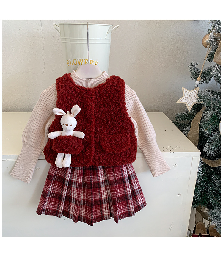Girls autumn and winter 2025 new fashionable furry thickened vest knitted top plush pleated skirt three-piece set