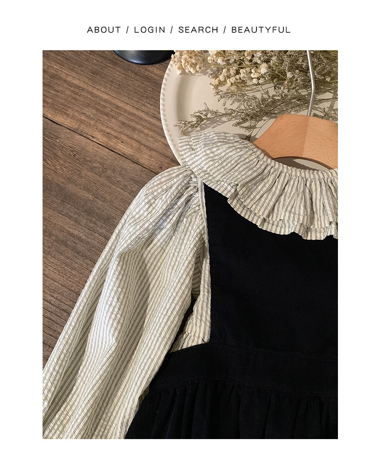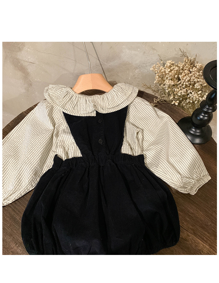韩版童装2025春秋新款洋气时髦娃娃领条纹衬衫时尚花苞背带裤套装