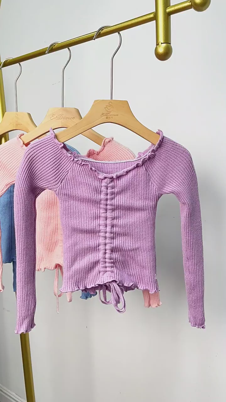 This dance practice top is super comfy! The ribbed knit fits nicely, and the ruffled edges add a sweet touch. With a drawstring at the bottom, you can adjust the fit easily. Perfect for dance sessions or casual wear.